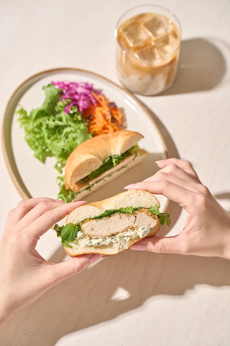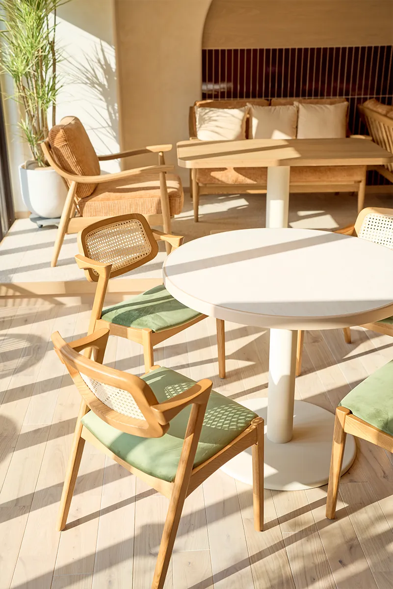 店内は、木の温もりを感じるテーブル席と、開放感あふれる空間。大きな窓から光が差し込む内装は、まるで公園の延長のような心地よさの中で、リラックスしてお過ごしいただけます。